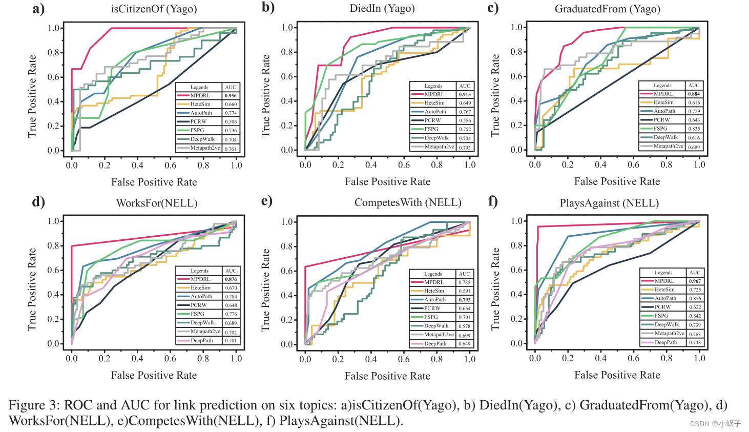 受试者工作特征(ROC)曲线和曲线下面积(Area under The curve, AUC)如图3所示。如图所示,使用我们的方法生成的元路径训练的分类器在所有六种关系中都表现出了卓越的性能。尽管现有的基于嵌入的方法,如DeepWalk和Metapath2Vec,在HIN上的表示学习方面取得了显著的进展,但我们发现,一旦HIN变得复杂,异质性会导致性能下降,DeepWalk证明了这一点。此外,有限的手工制作元路径也阻碍了Metapath2Vec的性能。此外,当两个对象通过较长的路径连接时,如GraduatedFrom的情况,这样的模型更糟糕。FSPG和AutoPath考虑了自己产生的各种元路径,因此性能优于PCRW和PCRW,说明越有效的元路径性能越好。此外,我们的RL代理实现的卓越性能表明,它能够生成许多有效的元路径。