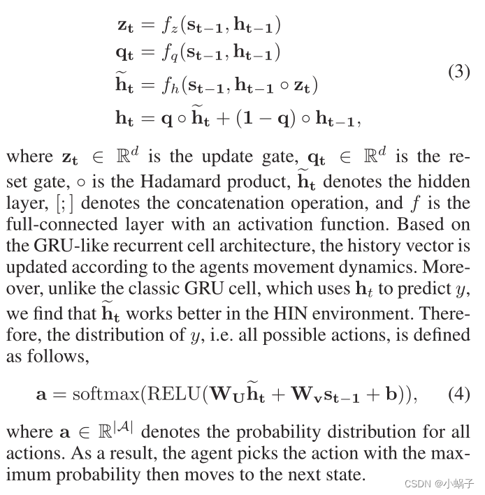 式中zt∈Rd为更新门,qt∈Rd为复位门,◦为Hadamard产品,ht为隐藏层,[;]表示连接操作,f为带激活函数的全连接层。基于类似于gru的循环细胞结构,根据智能体的运动动态更新历史向量。此外,不像经典的GRU细胞使用ht来预测y,我们发现?ht在HIN环境下工作得更好。因此,y的分布,即所有可能的动作,定义如下: