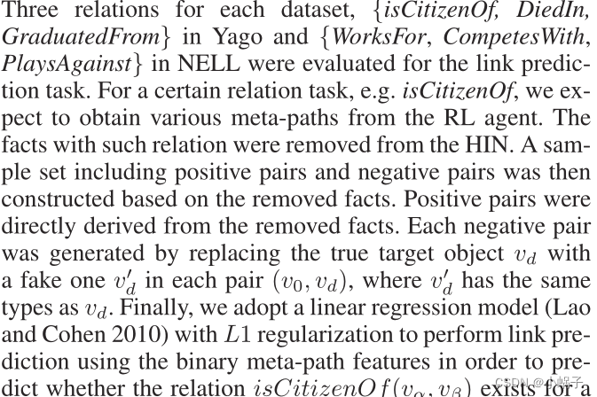 每个数据集的三种关系,Yago中的{isCitizenOf, DiedIn, GraduatedFrom}和NELL中的{WorksF or, CompetesWith, PlaysAgainst}被评估为链接预测任务。对于特定的关系任务,例如isCitizenOf,我们希望从RL代理获得各种元路径。与此相关的事实已从HIN中删除。然后根据去除的事实构造一个包含正对和负对的样本集。正对是直接从被移除的事实中得到的。每个负对是通过将真目标对象vd替换为伪目标对象v?每对中的D (v0, vd)其中v?D和vd有相同的类型。最后,我们采用带L1正则化的线性回归模型(Lao and Cohen 2010),利用二元元路径特征进行链接预测,以预测一个测试对(vα, vβ)是否存在citizenof (vα, vβ)关系。对于二进制元路径特性,如果一个元路径Ω连接一对(vα, vβ),二进制元路径特性的值为1,否则该值为0。
