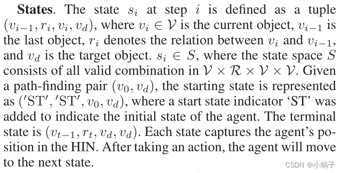 其中添加了启动状态指示器“ST”,以指示代理的初始状态。终端状态为(vt−1,rt, vd, vd)。每个状态都掌握了代理在HIN中的位置。在执行一个操作后,代理将移动到下一个状态。