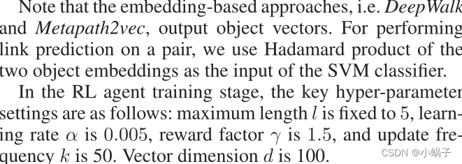 注意,基于嵌入的方法,如DeepWalk和Metapath2vec,输出对象向量。为了对一对对象进行链接预测,我们使用两个对象嵌入的Hadamard乘积作为SVM分类器的输入。在RL agent训练阶段,关键超参数设置如下:最大长度l固定为5,学习速率α为0.005,奖励因子γ为1.5,更新频率k为50。V向量d是100
