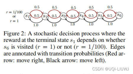 如果先到达s6再s1,那么奖励为1;如果没到达过s6,直接到达s1了,那么奖励为0.01.
