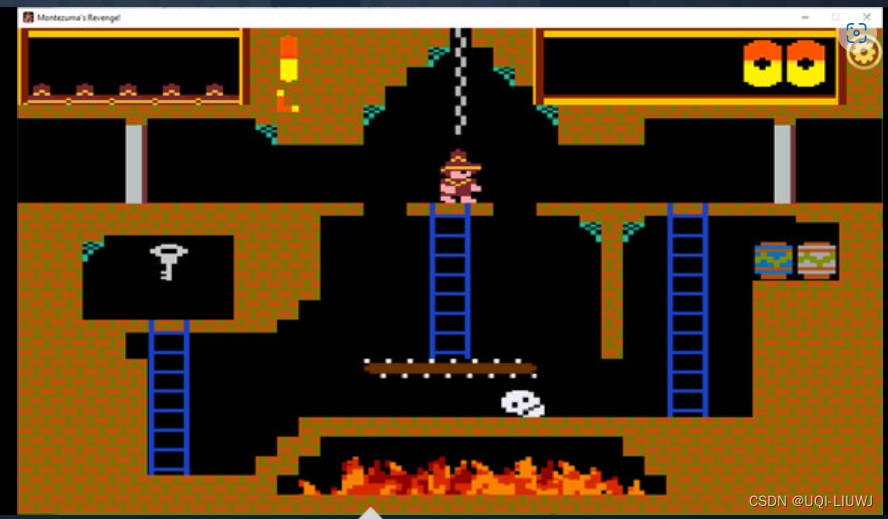 游戏要求玩家在收集宝藏的同时导航探险家(红色)穿过几个房间。 为了通过门(在图的右上角和左上角),玩家必须首先拿起钥匙。 然后玩家必须爬下右边的梯子,然后向左移动到钥匙,导致在收到奖励(+100)收集钥匙之前执行很长的动作序列。
