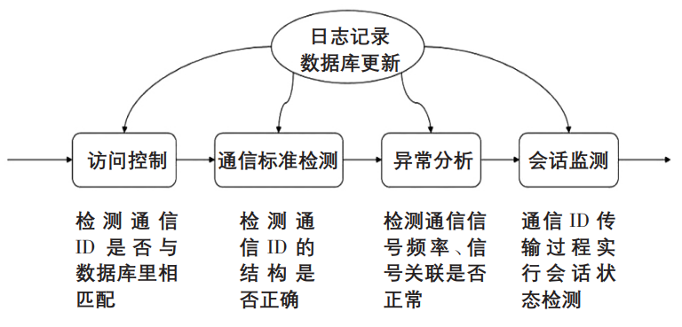 防火墙的异常检测技术有多种,常见的检测技术包括入侵异常检测方法,基于神经网络、聚类、遗传算法,基于信息熵、关联规则等。入侵异常检测方法主要通过对大量正常行驶的汽车的通信数据进行分析,构建汽车通信网络安全模型,并用该模型监视用户及系统的行为,分析是否存在异常的非法数据活动,并向用户报警记录。汽车报文分为周期报文和事件触发报文,入侵异常检测技术可以根据不同情况建立模型。周期报文是通过设定报文周期阈值构建入侵检测模型,将报文周期与阈值对比进行判定;事件触发报文没有固定的发送周期,但多数报文的操作指令相互关联,如汽车的车速信号与刹车信号存在负相关关系,油门踏板信号与车信号存在正相关关系。因此, 通过大量的数据分析构建通信报文正/负相关入侵检测模型,一旦报文关联出现较大的偏差,则判定为入侵行为并报警。由于汽车车载芯片的计算能力不足以同时实现安全性与实时性的最大化,因此现采用的入侵检测的方法需要在保证实时性的基础上,对入侵进行有效检测,目前针对汽车车载报文流量监测是最为有效的办法。安全防火墙中访问控制、通信标准检测、异常分析的入侵检测流程如 6 所示。