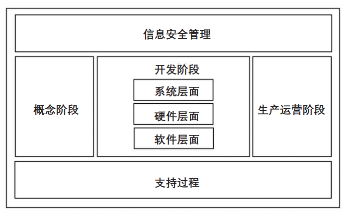 车辆信息安全架构主要由信息安全管理、核心信息安全工程活动以及支持过程 3 大部分构成。信息安全管理包括综合管理和生命周期各阶段的信息安全管理。核心信息安全工程活动包括了概念阶段,整车系统、软硬件层面的开发阶段及生产运营阶段等。在概念阶段制定整个安全项目计划,包括识别网络安全边界、系统外部依赖关系、系统潜在威胁分析以及评估。在开发阶段,对整车系统的脆弱性和威胁性进行风险分析,制定信息安全需求与策略,在开发阶段完成后进行渗透测试,完成最终的安全审计。生产运营阶段主要对产品进行现场监控、事件响应以及之后的时间跟踪管理。支持过程阶段主要对以上阶段进行辅助支持,包括相应的配置管理、文档管理和供应链 管理等。