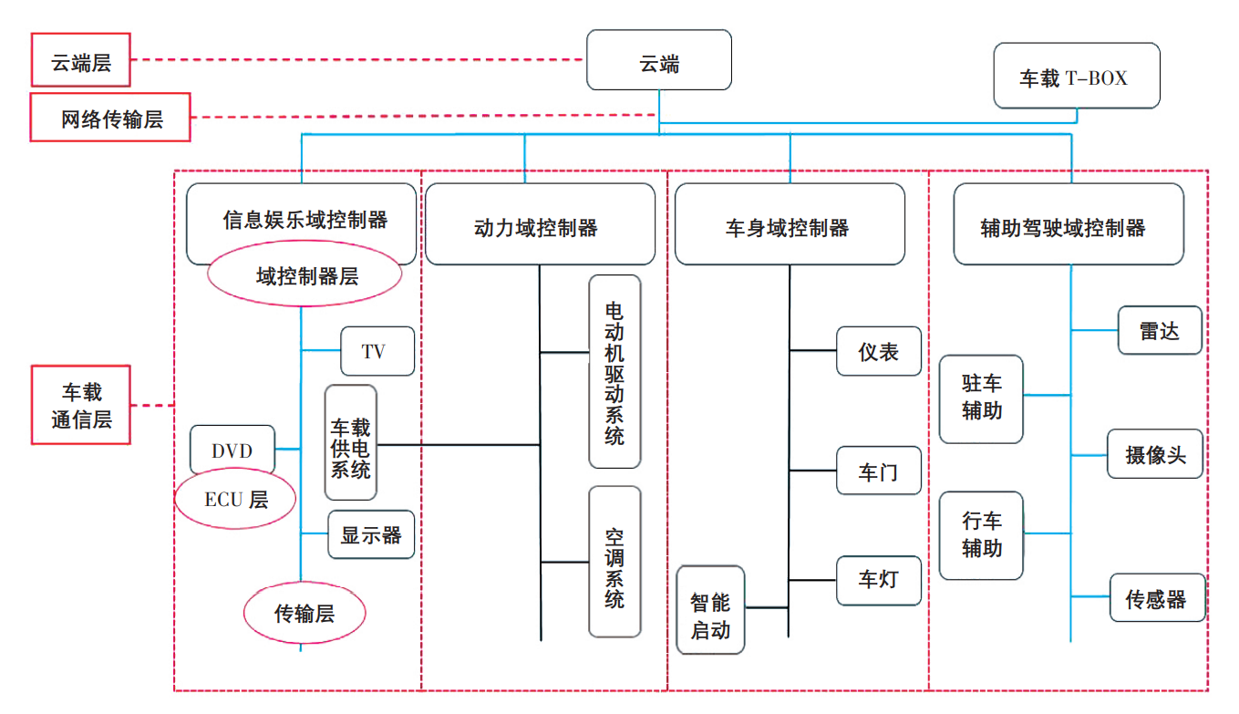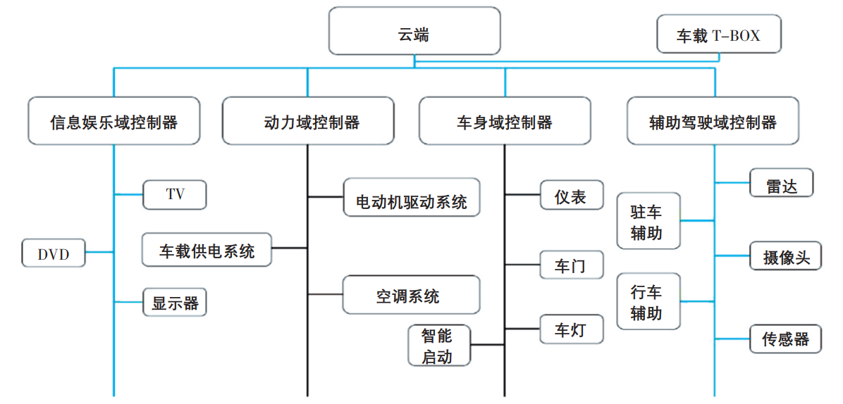 汽车域集中式电子电气架构的出现,为信息安全以及算力不足的问题提供了解决方案。汽车域集中式电子电气架构指的是将汽车根据功能划分为若干个功能块,每个功能块以域控制器为主导搭建,各个功能域内部通信可根据不同功能的通信速率需求采用不同种类的通信总线,如 CAN、LIN、FLEXRAY、MOST 等总线,各个功能域之间的通信通过传输速率更高的以太网实现信息交换,域集中式电子电气架构图如图 3 所示。域控制器主要负责传递域与云、域与域以及域内部的通信。域内 ECU 仅负责相应执行器件的操作指令,采用带有通信功能的控制器即可。