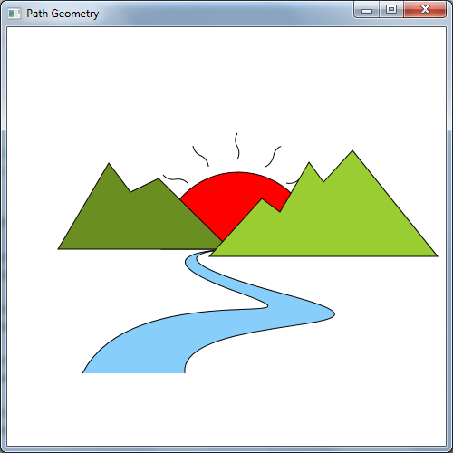 分析一下这幅图,一共有四个独立的图形,两座小山,一个太阳,一条小溪。小山全部由直线构成。太阳由五条曲线和一条弧线构成。小溪由两条曲线构成。我们将每个图形作为一个独立的path geometry,单独创建。
