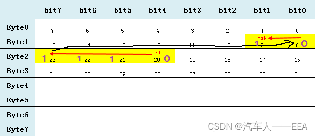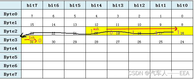 当一个信号的数据长度超过 1 个字节(8 位)或者数据长度不超过一个字节但是采用跨字节方式实现时,该信号的高位(S_msb)将被放在低字节(MSB)的高位,信号的低位(S_lsb)将被放在高字节(LSB)的低位。信号的起始位就是高字节的低位。