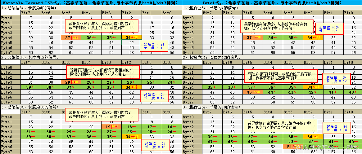 在定义CAN通信矩阵或制作dbc时,需确定报文的信号排列方式。字节的排列顺序有:Intel的排列顺序;Motorola的排列顺序。