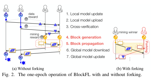 如果另一个矿工M2在第一个生成的块的传播延迟内成功地生成了它的区块,那么一些矿工可能会错误地将第二个生成的块添加到它们的本地账本中,这被称为forking(分叉)。在BlockFL中,forking使一些设备将不正确的全局模型更新应用到它们的下一个局部模型更新。forking频率随着λ和块传播延迟的增加而增加,其减缓会产生额外的延迟。