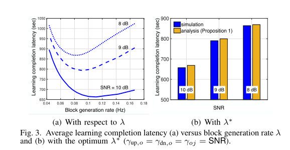 图3显示了块生成速率 λ 对Block FL 的平均学习完成延迟的影响