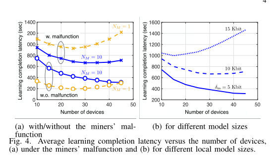 - 在图4-a中,计算了在NM= 1和NM= 10条件下,无论矿工是否发生故障,平均学习完成延时。