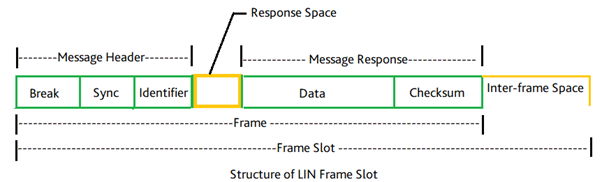 帧结构:数据以固定格式的信息(可选择长度)在总线上传输。主站任务传送一个报头,包括一个中断信号,然后是同步和标识符字段。每当有请求时,从站都会以信息(以包含 2、4 和 8 个数据字节以及 3 个字节的控制信息的数据帧的形式)进行响应。从属设备不会自己进行通信;只有主站可以使它们进行通信。所有的消息都是由主站发起的,最多只有一个从站对给定的消息标识符进行回复。如果从属任务需要发布响应,它将向总线传输1到8个数据字节,然后是一个校验字节。主节点也可以通过回复其消息来充当从节点。由于主节点发起了所有的通信,因此没有必要实施冲突检测。