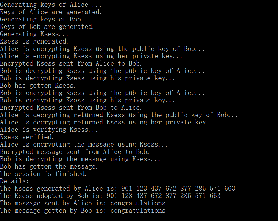 //步骤4:Alice解密数据包并确认会话密钥是否正确,若错误,会话结束,否则把用会话密钥加密的信息发给Bob
