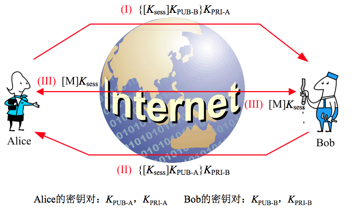 | KPUB-A | Alice的公钥 | 用于非对称加密,Bob使用它来对会话密钥进行第一层加密和验证Alice的数字签名。 所有人都可以用公钥来加密要传输给Alice的信息,但只有使用Alice的私钥才能解密。如果没有它,所有人都可以在用Bob的公钥解开第一层签名后,获得会话密钥。 所有人都可以用公钥来验证Alice的数字签名,但只有使用Alice的私钥才能进行签名。如果没有它,将无法确认数据包是否由Alice发出。 |