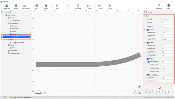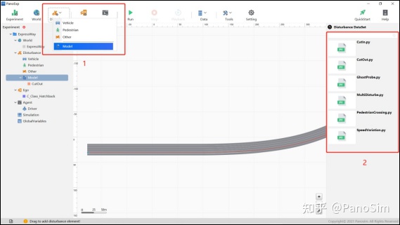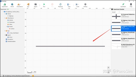 Step 1:双击桌面上 PanoExp 图标,启动 PanoSim GUI,进入实验主界面。在属性栏选中“M_Highway_CutOut_disturbance”拖到工作区,如图 5.15 所示。