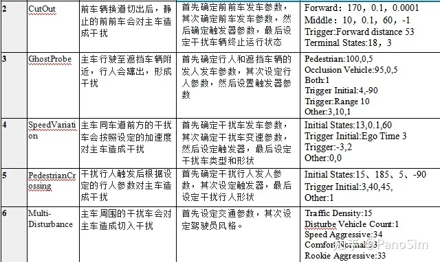 PanoSim 提供丰富的交通接口(见《PanoSim5.0-API 文档》),基于交通接口可以开 发种类丰富的干扰模型,实现对测试主车的干扰测试。产品提供的干扰模型用例有,CutIn 切入、CutOut 切出、GhostProbe 鬼探头、SpeedVariation 变速干扰、PedestrianCrossing 行人 横穿和 Multi-Disturbance 多车干扰。各干扰交通模型的功能描述和逻辑实现见表 5-6 所示, 具体模型的 UI 参数设置及含义见 5.3.2 参数说明。