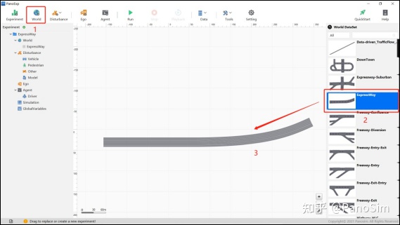 Step 1:双击桌面上 PanoExp 图标,启动 PanoSim GUI,进入实验主界面。在工具栏点 击 World 按钮,在右侧属性栏中选中 ExpressWay,并将其拖入工作区,如图 5.17 所示。