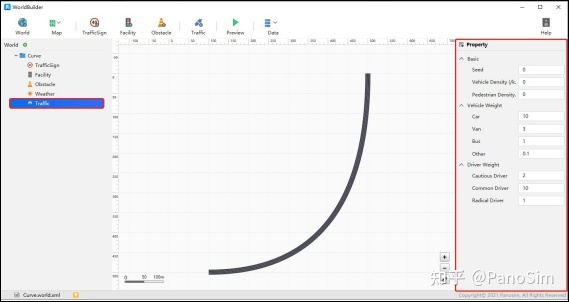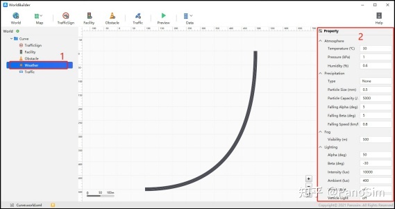 为获得更好的场地展示效果,在 Experiment 配置窗口 World 下鼠标右击地图名 Curve 在 弹出的对话窗中选择 Open 可以快速打开 WorldBuilder,也可以在 PanoExp 下使用鼠标左键 点击 Tool 按钮并选择 WorldBuilder,选择 Curve 地图并对此场景相关参数进行调整,如图 3.12~3.13 所示,例如,可以设置交通标识牌、信号灯、路障、天气、随机交通流等。下面 以天气和随机交通流为例进行介绍。