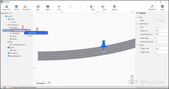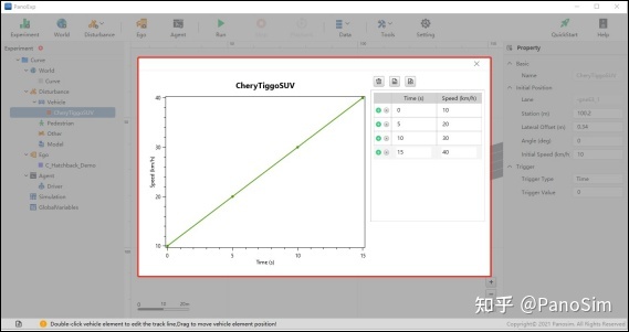 在左侧 Experiment 配置窗口,鼠标左键点击 CheryTiggoSUV 图标,可以实现对车辆速 度表设置,如图 3.25~3.26 所示。