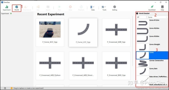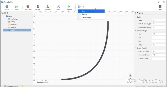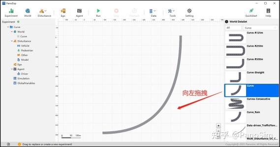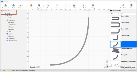 为了更快地体验 PanoSim,建议使用 PanoSim 自带场景模板。在 PanoExp 界面上方场 景工具栏中点击 World 按钮,在右侧弹出的属性栏中选择您所需场地,选择曲线道路 Curve 实验,鼠标左键点击选择的 Curve 道路后,按住鼠标左键向左拖入工作区,可以加载 Curve实验至工作区,如图 3.8~3.9 所示。此时,实验默认名为 Curve,如图 3.10 所示,可以通过 点击 Data 选择 Save as,进行重命名操作,如图 3.11 所示。