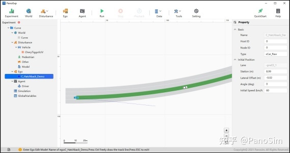 添加被测车辆:在界面上方工具栏中点击 Ego 按钮,选择您所需要的被测车辆:选中 C_Hatchback_Demo,按住鼠标左键将其拖动到实验道路上,如图 3.20~3.22 所示,该实验 中车辆 C_Hatchback_Demo 所在道路编号为 Lane ID:-gneE3_1,Station:10.00,Lateral Offset: 0。与此同时,用户可以对车辆初始位姿、速度等参数进行调整。