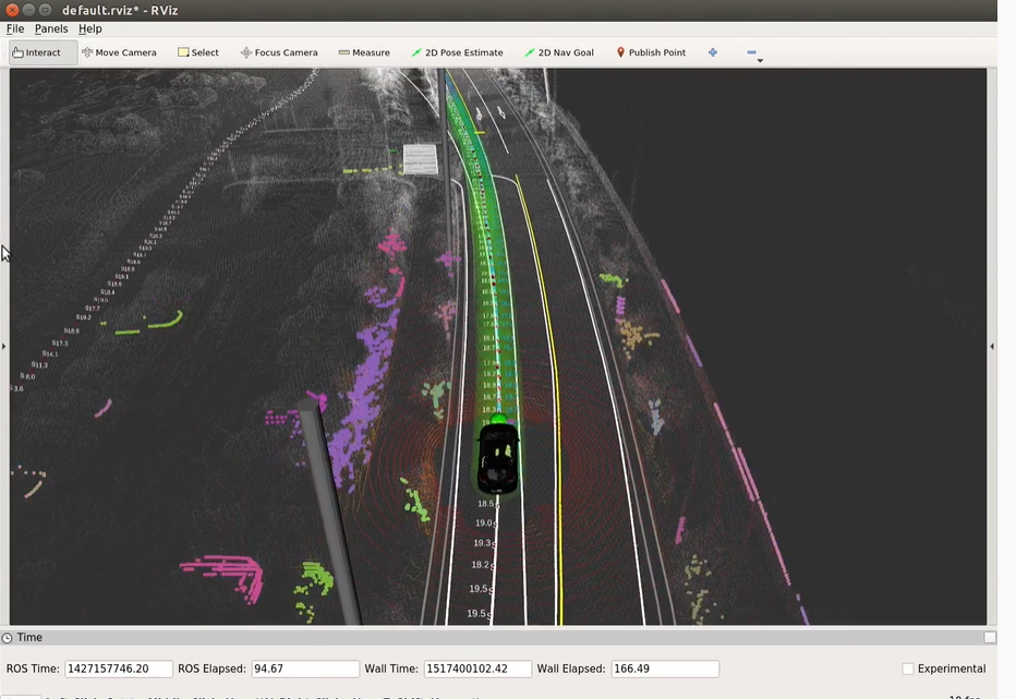 这里使用Autoware软件模拟出来的,绿色的线是规划车辆行驶的轨迹,如果大家觉得不错的,可以尝试动手实现呀。