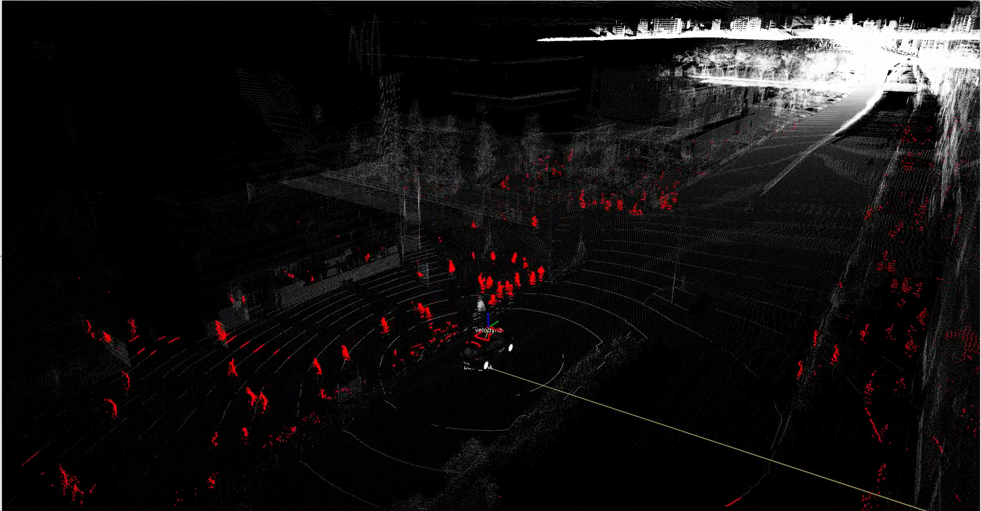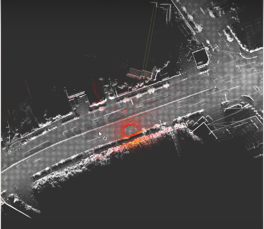在图片中我们能看到它感知到行人(红色的),一圈一圈类似于水纹的是激光雷达发出的光波。