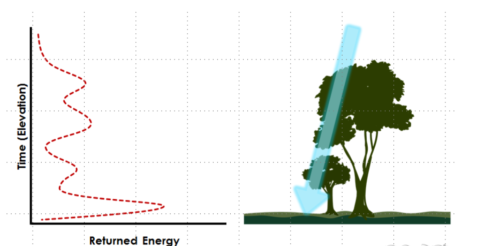 光能是光子的集合。当组成光的光子移向地面时,它们撞击树上的树枝等物体。一些光从那些物体反射回来并返回到传感器。如果物体很小,并且周围有空隙可以让光线通过,则有些光线会继续向下射向地面。由于某些光子从分支之类的物体反射而其他光子则继续向下反射至地面,因此从一个光脉冲中可能会记录多次反射。
