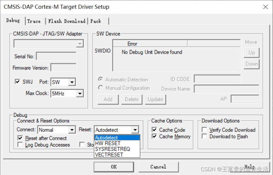 在使用野火的DAP是,出现了标题中的问题,并且魔术棒/Debug/Reset中没有Autodetect选项。