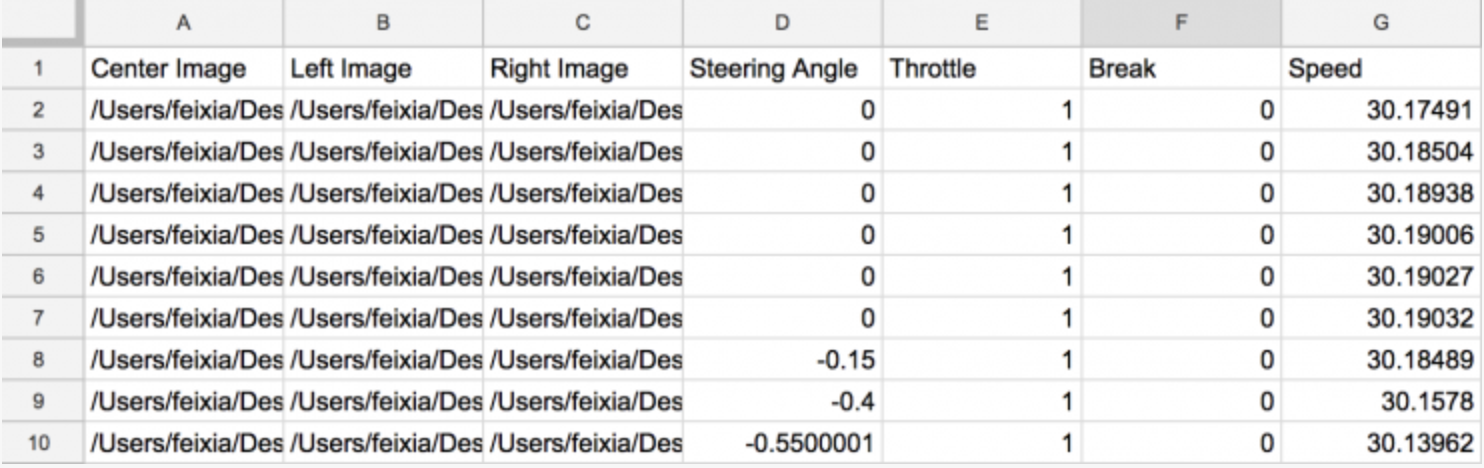再次点击右上角RECOED,当其变成RECORDING时,就可以手动驾驶小车了,大概驾驶8,9分钟,点击右上角RECORDING,界面中间出现绿色Capturing Data,表示正在记录并存储图片与转向角,8,9分钟左中右三个摄像头共可采集2万多张图片,这时,在相应目录下会生成两个文件: driving_log.csv和IMG文件夹。顾名思义,driving_log.csv中保存了用户开车时的log,IMG文件夹中保存了摄像头的照片。driving_log.csv基本结构如下图。