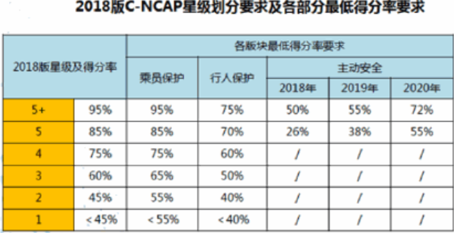C-NCAP2018 首次引入了主动安全评价。主动安全赋分共计 15 分占整个 C-NCAP 评价得分的 15%,其中 AEB 相关部分占 11 分,是主动安全测试的主要部分。根据该规范,2019 年起,没有配备 AEB 系统的车辆将无法得到五星认证。