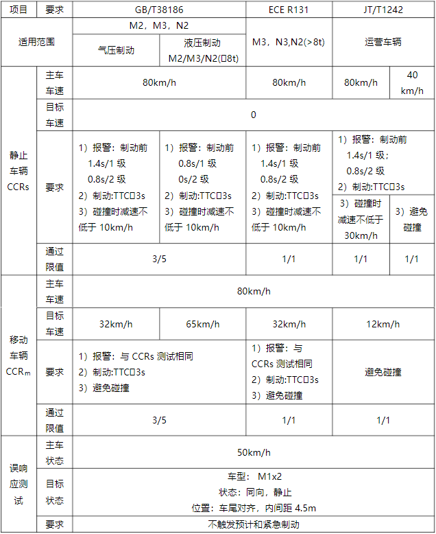 首先说一说商用车,针对商用车的标准主要是 ECE-R131 和 GB/T38186-2019,其中 GB/T38186 可以被视为 ECE-R131 放宽条件的中文版。