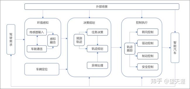 1)自动驾驶汽车是通过搭载先进的车载传感器、控制器和数据处理器、执行机构等装置,借助车联网、5G和V2X等现代移动通信与网络技术实现交通参与物与彼此间的互换与共享,从而具备在复杂环境下的传感感知、决策规划、控制执行等功能。