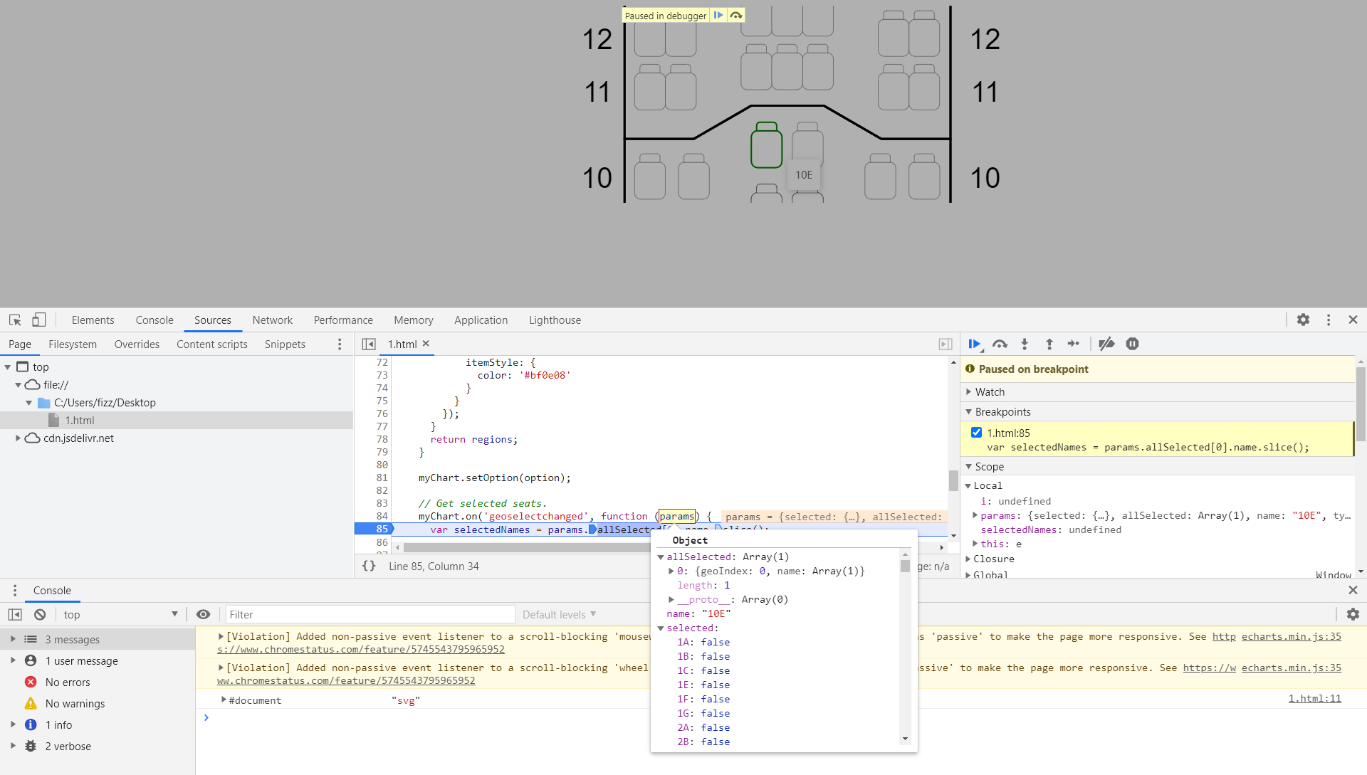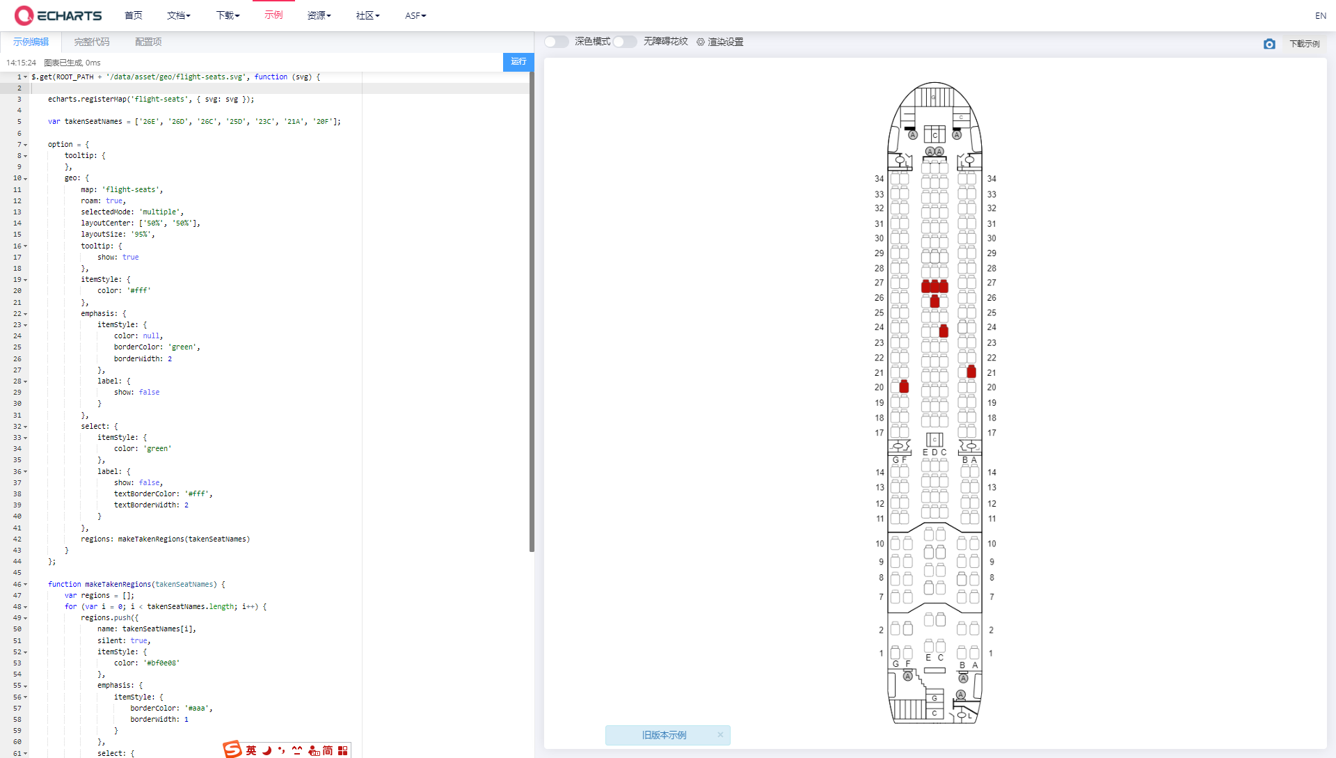 最近在echarts官方看到了一个航班选座的示例,感觉很好,可以扩大,缩小,鼠标放置到座位上可以显示座位号,允许默认选中座位。于是在5.1假期抽了一点点时间,来写一篇文章,深入研究分析一下这个示例,解析一下这个示例的完整代码。首先让我们来看下示例的效果图。