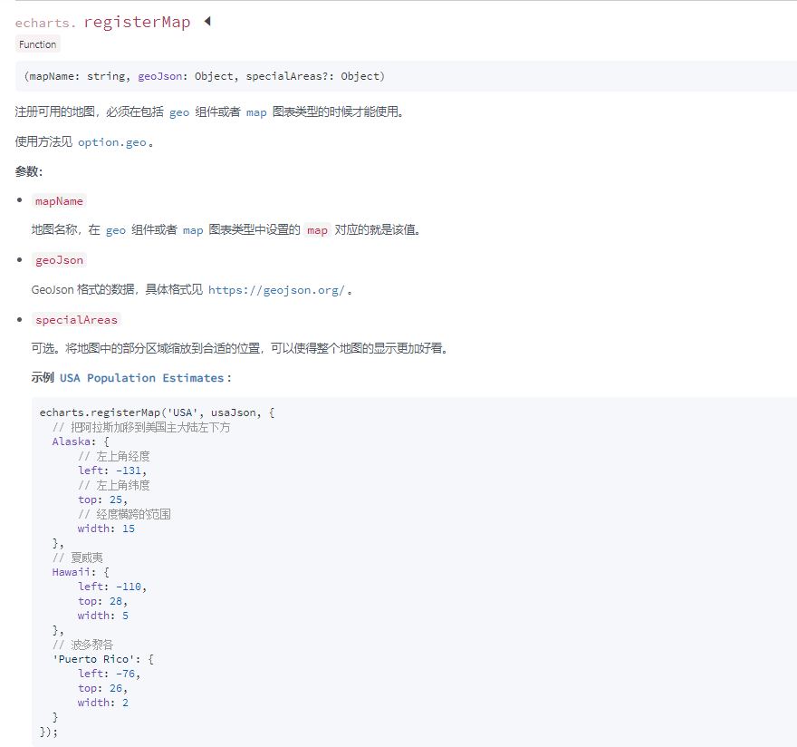 文档的大致意思就是 你可以配置一个geoJson的东西,然后echarts可以解析内部的坐标,然后渲染,支持查找。
