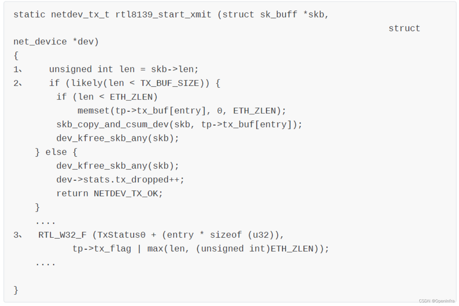 数据包在linux内核中经过tcpip协议栈后,最后一步要调用驱动程序的ndo_start_xmit方法,对于rtl8139设备,这个函数是rtl8139_start_xmit。