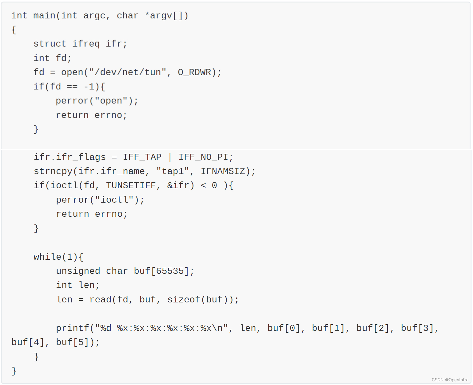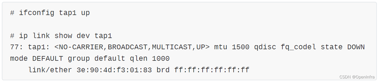只有当应用程序连接到这个设备时,tap设备的状态才会被kernel设置为连接状态,我们可以写个demo程序,从tap设备读取数据包,模拟qemu读取的过程。