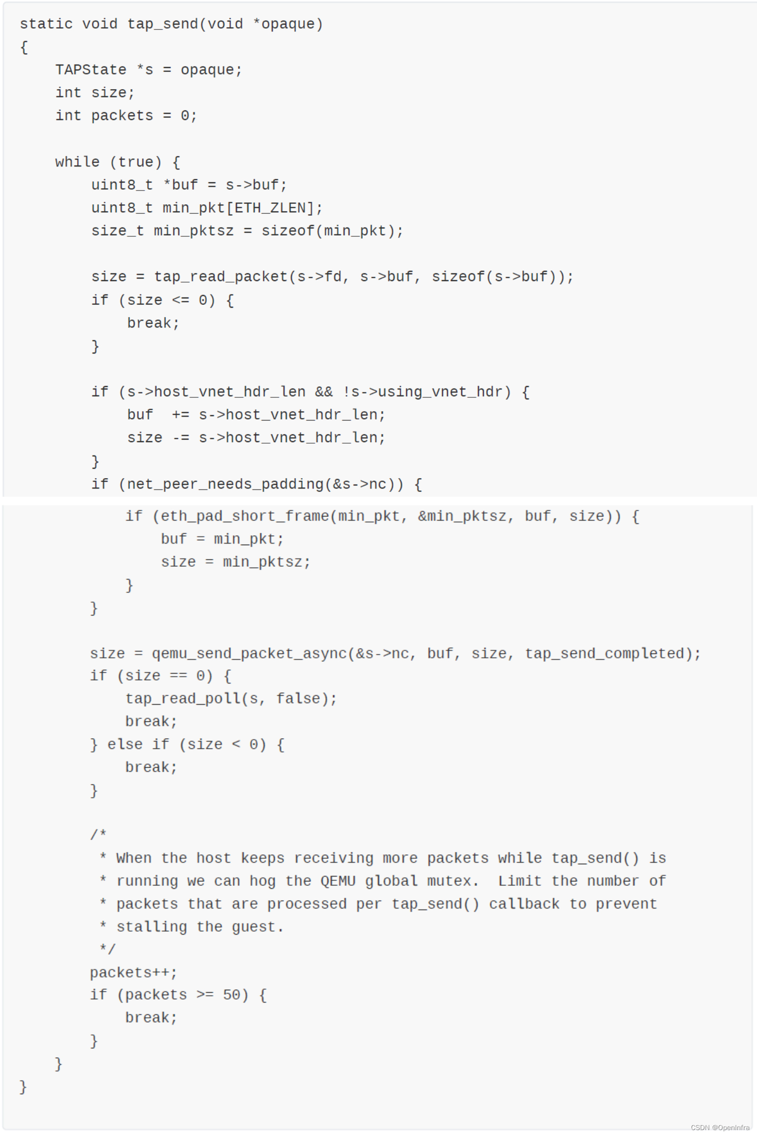 从tap_send,可以看出qemu一次最多读取50个数据包,防止tap_send函数过多的占用cpu时间。