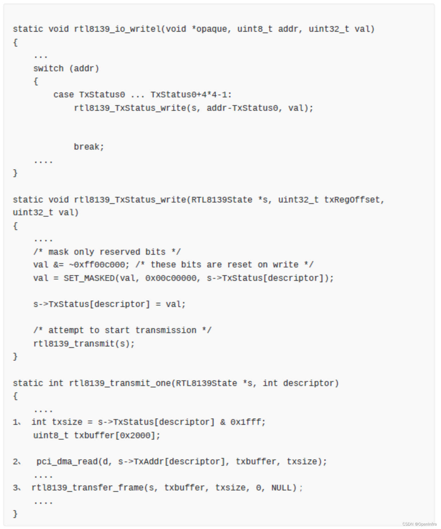 从虚拟机中发包的流程和上述收包的流程类似,不过方向是反过来的,发包前,虚拟机内部驱动需要构造出数据包的相关metadata,如并且告诉硬件数据包的地址和长度等信息,我们以rtl8139 c mode为例,看下linux内核如何处理这个过程: