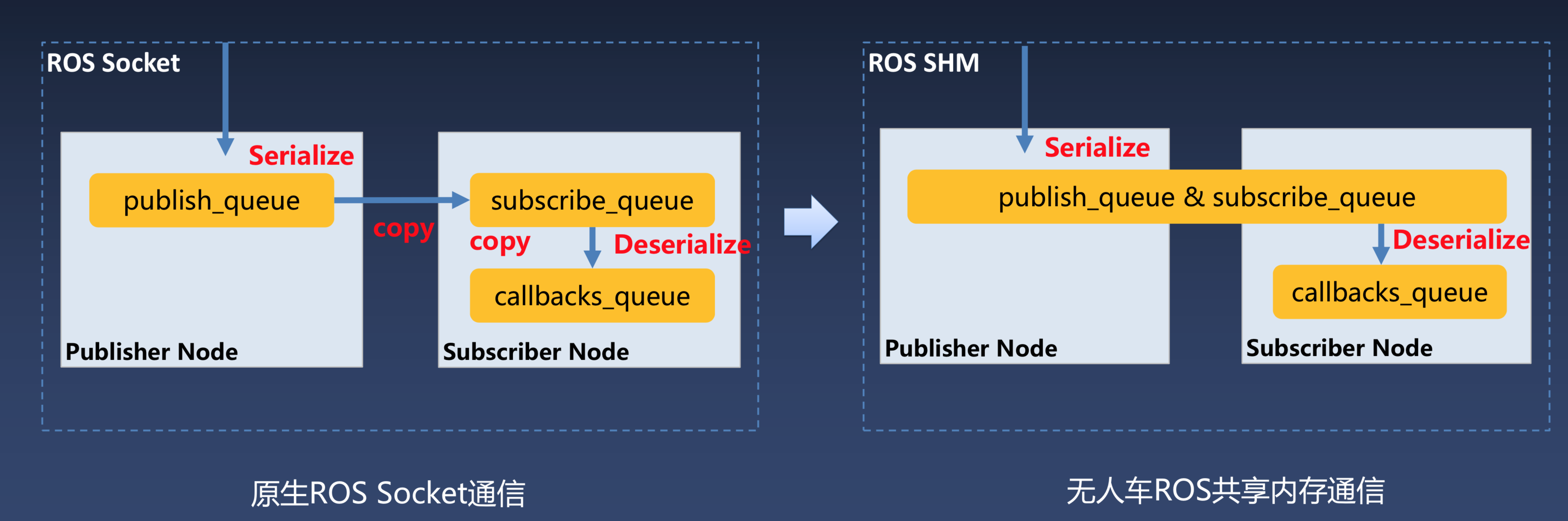 自动驾驶车辆中包含了大量的传感器,这些传感器可能以非常高频的速度产生数据,所以整个系统对于数据传输效率要求很高。在ROS系统中,从数据的发布到订阅节点之间需要进行数据的拷贝。在数据量很大的情况下,很显然这会影响数据的传输效率。所以Apollo项目对于ROS第一个改造就是将通过共享内存来减少数据拷贝,以提升通信性能。如下图所示:
