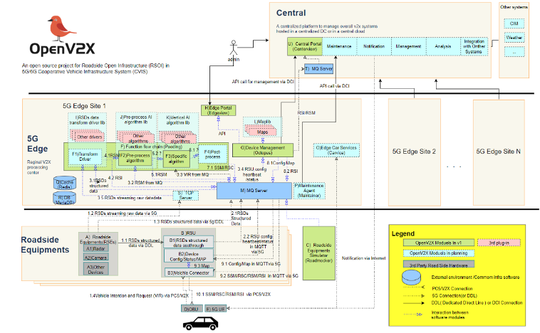 随着5G、边缘计算等新技术与智能网联汽车融合应用越来越深入,我国正在加快建立车联网标准体系,初步构建了车-路-云-网-图系统发展的生态系统。目前,OpenV2X车路协同开源项目主要致力于路侧开放基础设施的模块。OpenV2X车路协同开源架构设计范围包含路侧设备、中心云控以及5G边缘云控三部分。