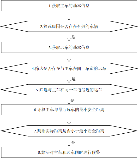 关于C-V2X前向碰撞预警的算法实现,首先需要了解一下前向碰撞预警算法流程图,如下图所示: