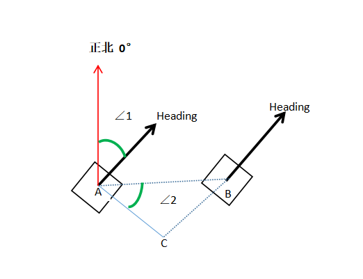- 确定∠2的大小,在图中我们不难发现,∠1和∠2为同一个角的余角,所以∠1和∠2相等,又因为∠1为航向角Heading,所以∠2也为Heading大小。
