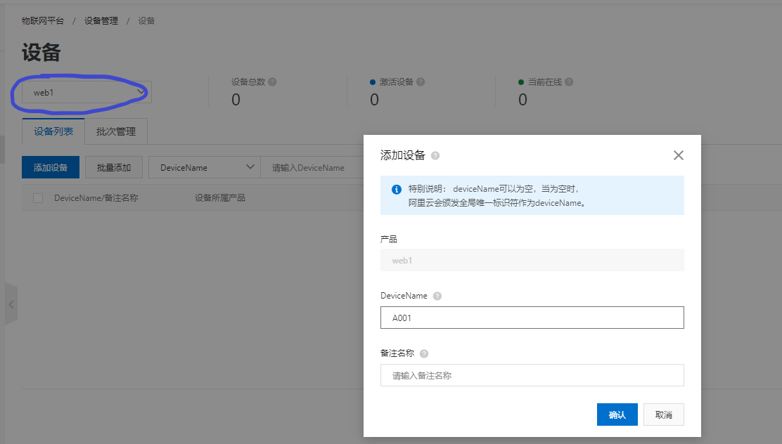 4、在新建立的产品下面,添加设备