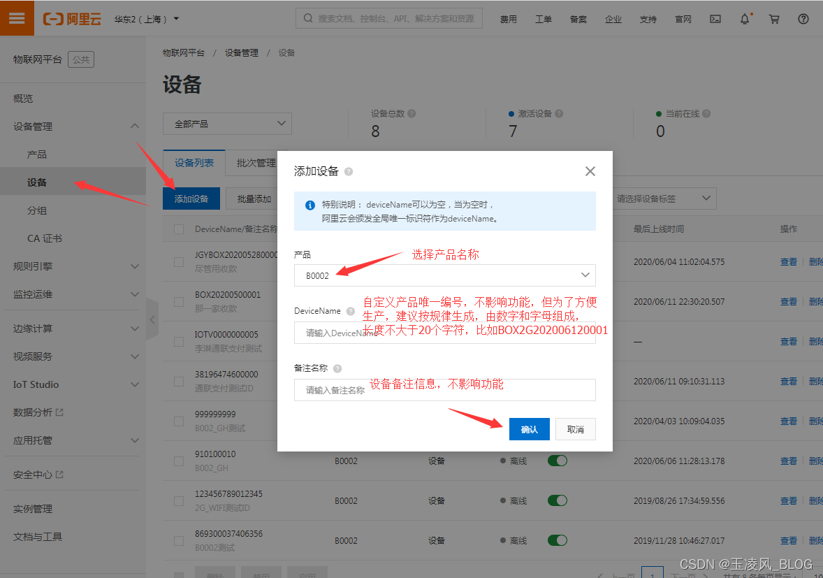 三、进入设备界面,点击“添加设备”或“批量添加”。(在创建完产品之后,也会提示创建设备,与这里进入的界面是一样的。注意:DeviceName 长度不能超过 20个字符)