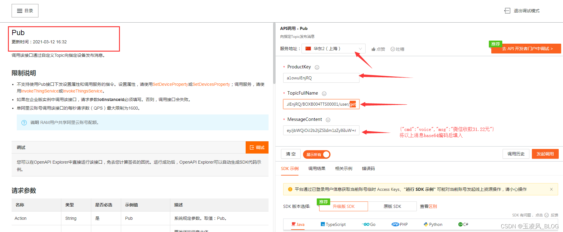 七、服务器相关API列表参考阿里云官方文档: https://help.aliyun.com/document_detail/69893.html?spm=a2c4g.11174283.6.750.15001668S6CvRa其中服务器向设备发送消息,调用的是 pub接口 ,阿里云提供了在线调试平台,调试成功,会生成示例代码,如下图所示: