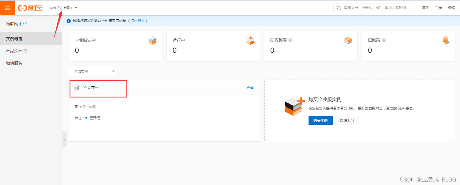 一、登录阿里云物联网平台:https://iot.console.aliyun.com/lk/summary/new 如下图所示。(注意:公共实例 在 华东2(上海),企业版实例可以选择任意支持的站点。)
