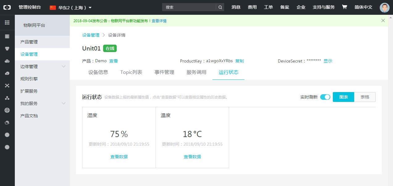 回到控制台,在运行状态页面,激活 实时刷新,就可以看到温度和湿度值了