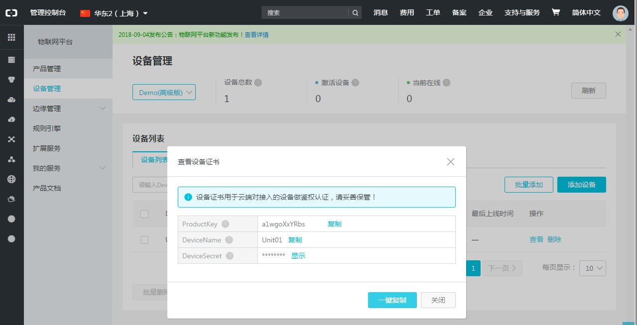 首先点击设备管理,并在下拉菜单中选择Demo产品